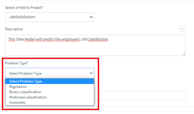 Select the Problem Type you would like this Data Model to use. Problem Types are the different analysis methods that can be used for this machine learning functionality.