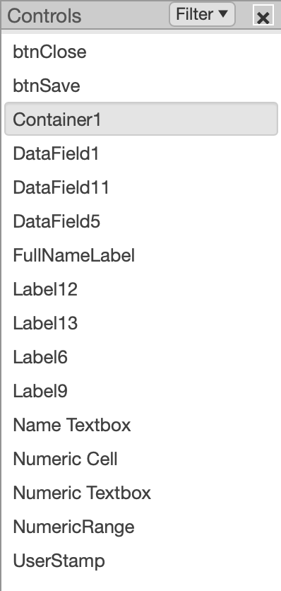 - Form Fields: On the left-hand side you will see a toolbar with available fields and components that can be dragged onto the designer. These components include buttons, labels, text boxes, and images. Immediately to the right of this toolbar is the Controls window that will list all fields and components currently being used on the form.