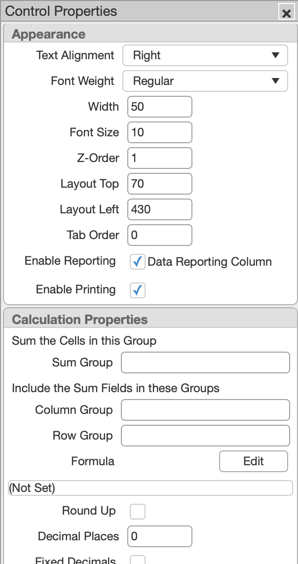 - Round-Up – This will round up the answer from the formula to the nearest decimal place as defined in the Decimal Places property.